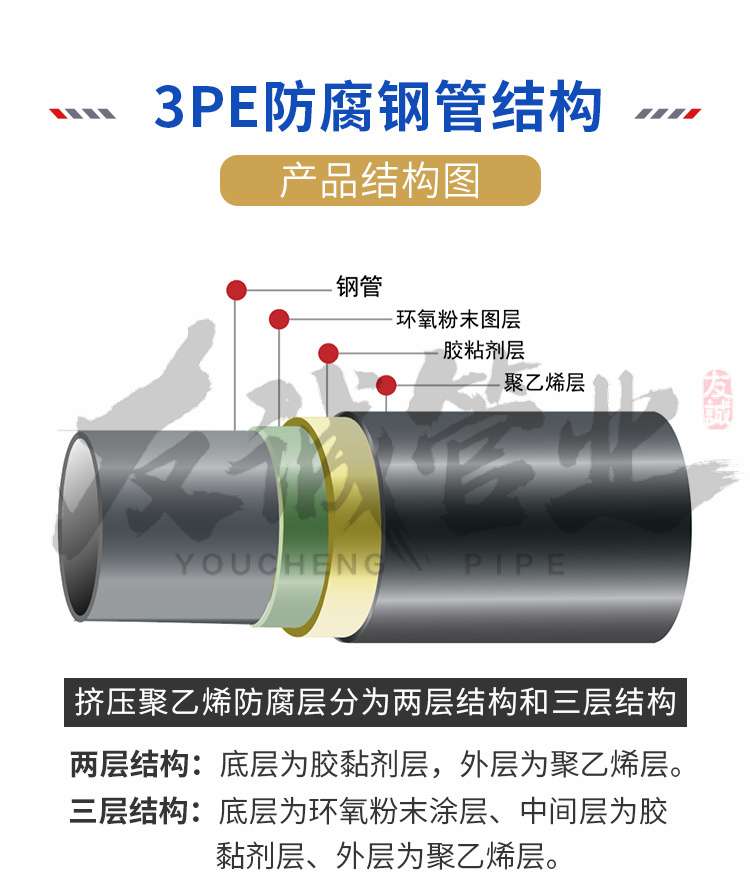 3pe防腐鋼管三層結(jié)構(gòu)聚乙烯防腐層(3pe)綜合了熔結(jié)環(huán)氧粉末涂層和擠壓聚乙烯兩種防腐層的優(yōu)良性質(zhì),將熔結(jié)環(huán)氧粉末涂層的界面特性和耐化學(xué)特性,與擠壓聚乙烯防腐層的機(jī)械保護(hù)特性等優(yōu)點(diǎn)結(jié)合起來(lái),從而顯著改善了各自的性能管道的管壁事前進(jìn)過(guò)了符合環(huán)氧粉末工藝的加熱,當(dāng)粉末與管壁接觸后,會(huì)導(dǎo)