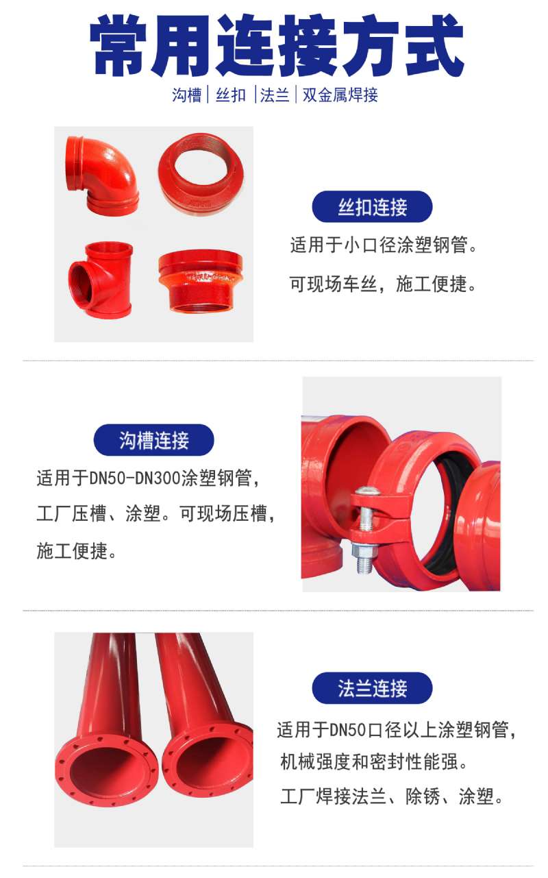 涂塑消防鋼管,以鋼管為基管,外壁涂裝高附著力,抗沖擊性,防腐耐候型的熱固性粉末涂料,內(nèi)壁涂裝高附著力,防腐,食品衛(wèi)生型的熱塑性粉末涂料,采用噴砂化學雙重前處理。涂塑鋼管具有優(yōu)良的耐腐蝕性和比較小的摩擦阻力,環(huán)氧樹脂涂塑鋼管適用于給排水,海水,溫水,油,氣體等介質(zhì)的輸送
