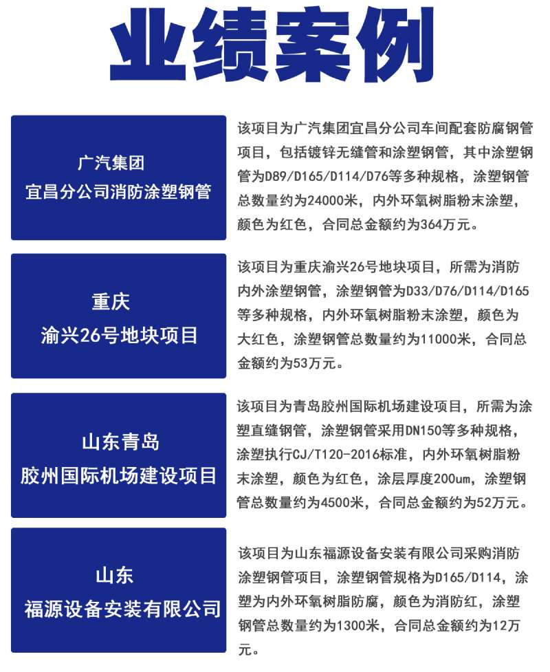 涂塑消防鋼管,以鋼管為基管,外壁涂裝高附著力,抗沖擊性,防腐耐候型的熱固性粉末涂料,內(nèi)壁涂裝高附著力,防腐,食品衛(wèi)生型的熱塑性粉末涂料,采用噴砂化學雙重前處理。涂塑鋼管具有優(yōu)良的耐腐蝕性和比較小的摩擦阻力,環(huán)氧樹脂涂塑鋼管適用于給排水,海水,溫水,油,氣體等介質(zhì)的輸送,聚氯乙烯涂塑鋼管適用于排水,海水,油,氣體等介質(zhì)的輸送,涂塑鋼管具有優(yōu)良的承壓性能和抗腐蝕性能。