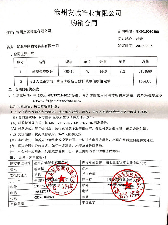 2019年8月9日我公司與湖北王剛物貿(mào)實(shí)業(yè)有限公司簽署購(gòu)銷(xiāo)合同,市政管廊工程用DN600涂塑復(fù)合鋼管1440米,我公司專(zhuān)業(yè)于涂塑復(fù)合鋼管領(lǐng)域,目前國(guó)內(nèi)多地區(qū)的管廊工程建設(shè),給排水管道多用于涂塑復(fù)合鋼管,今后我們多重視于產(chǎn)品質(zhì)量,提高服務(wù)。