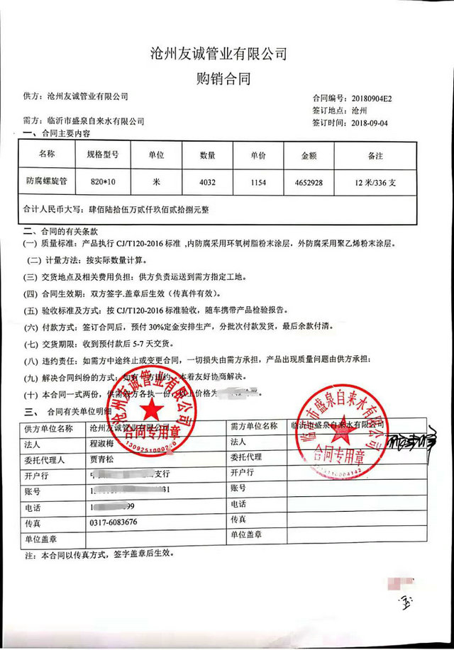 2018年9月我公司與沂州水務集團臨沂市盛泉自來水有限公司簽訂TPEP防腐螺旋鋼管購銷合同,DN800內外防腐鋼管4000米,感謝張總的信任,與貴公司的合同讓我們公司在自來水管道領域有了一個新的突破,歡迎各界領域客戶前來合作.